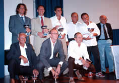 Foto di gruppo durante la serata di premiazione al Centro congressi dell'Hotel Il Faro di Pugnochiuso. Da sinistra in piedi Giovan Battista Olivero, Nicola Occhipinti, Isidoro Spanò, Giuliano Annibali, Leonardo Caporilli, il presidente Stefano Porcù. Accosciati Filippo Grassia, Carlo Annovazzi e Dario Cresto-Dina